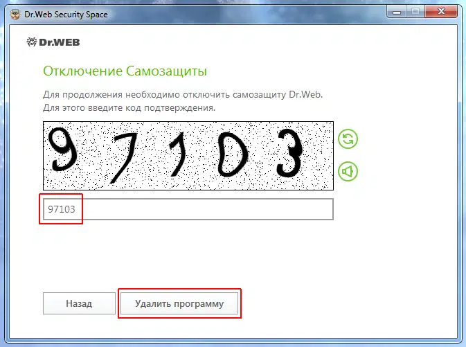В окне "Отключение самозащиты", введите символы с изображения и нажмите "Удалить программу":