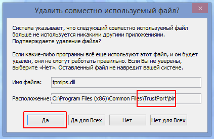 В процессе удаления, могут появляться запросы на удаление совместно используемых файлов. Обратите внимание на расположение файла - если файл находится в папке "TrustPort", то нажмите "Да" для его удаления. Если файл находится в системном каталоге "Windows" - рекомендуем его не удалять, так как это может нарушить работу других программ.