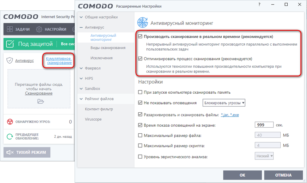 В окне настройки Comodo Internet Security за работу антивируса отвечает опция Производить сканирование в реальном времени на вкладке Антивирусный мониторинг. Когда данная опция отмечена, возможны два режима работы антивируса: Кумулятивное сканирование и Сканирование по доступу.