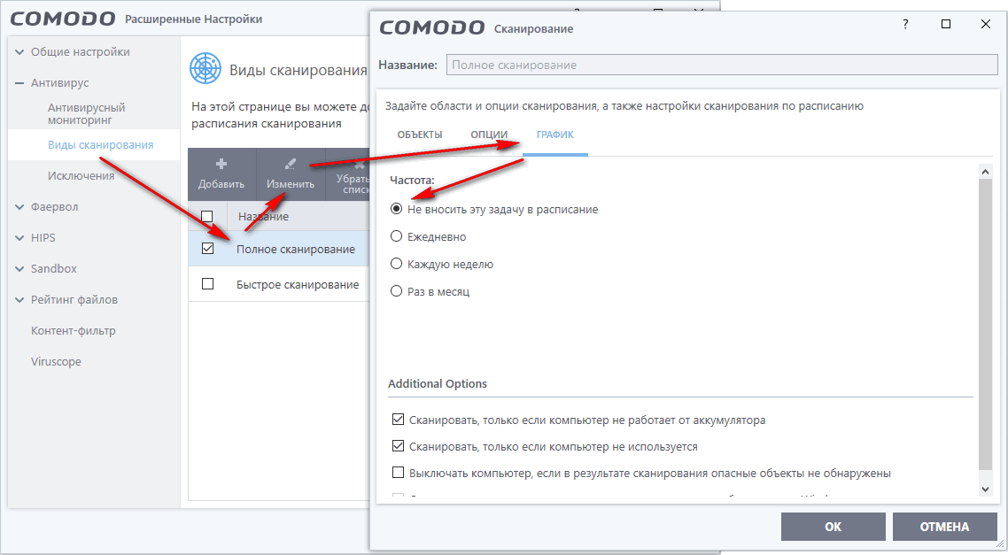 Отключение запланированного сканирования