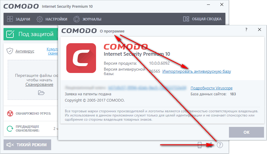 Для ручного офлайн-обновления антивируса следует в главном окне CIS нажать значок справки, выбрать пункт О программе, затем Импортировать антивирусную базу и указать путь к файлу с базой. Этот файл можно скачать непосредственно или скачать в архиве по ссылке на странице официального форума.