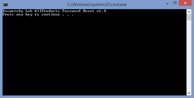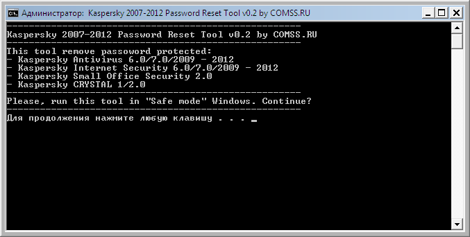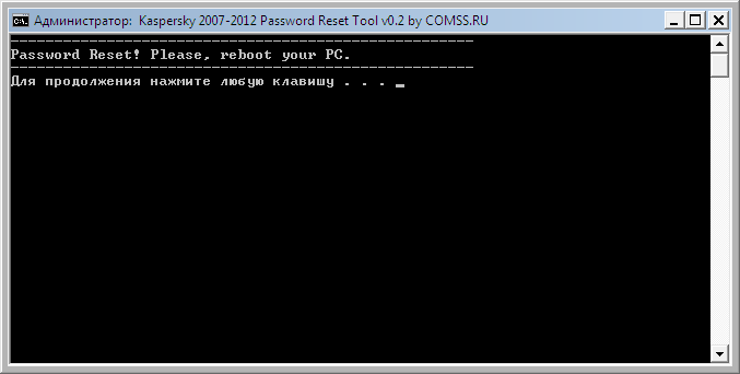 Перезагрузите компьютер в Безопасном режиме. Запустите файл kaspersky_2007_2012_pass_reset.bat и, после появления командной строки, нажмите любую клавишу на клавиатуре.
