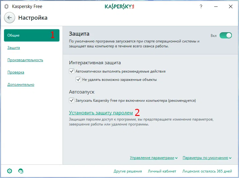 В версиях 2014 - 2017 и Kaspersky Free, выберите вкладку "Общие" и щёлкните по "Установить защиту паролем":