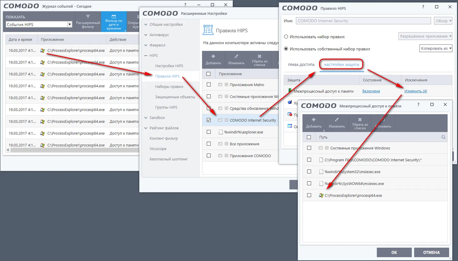 Побочным эффектом самозащиты CIS является огромное количество записей в журнале «События Защиты+» при использовании некоторых программ, например, ProcessExplorer. Можно избавиться от необязательных блокировок, разрешив отдельным приложениям доступ к памяти группы «COMODO Internet Security».