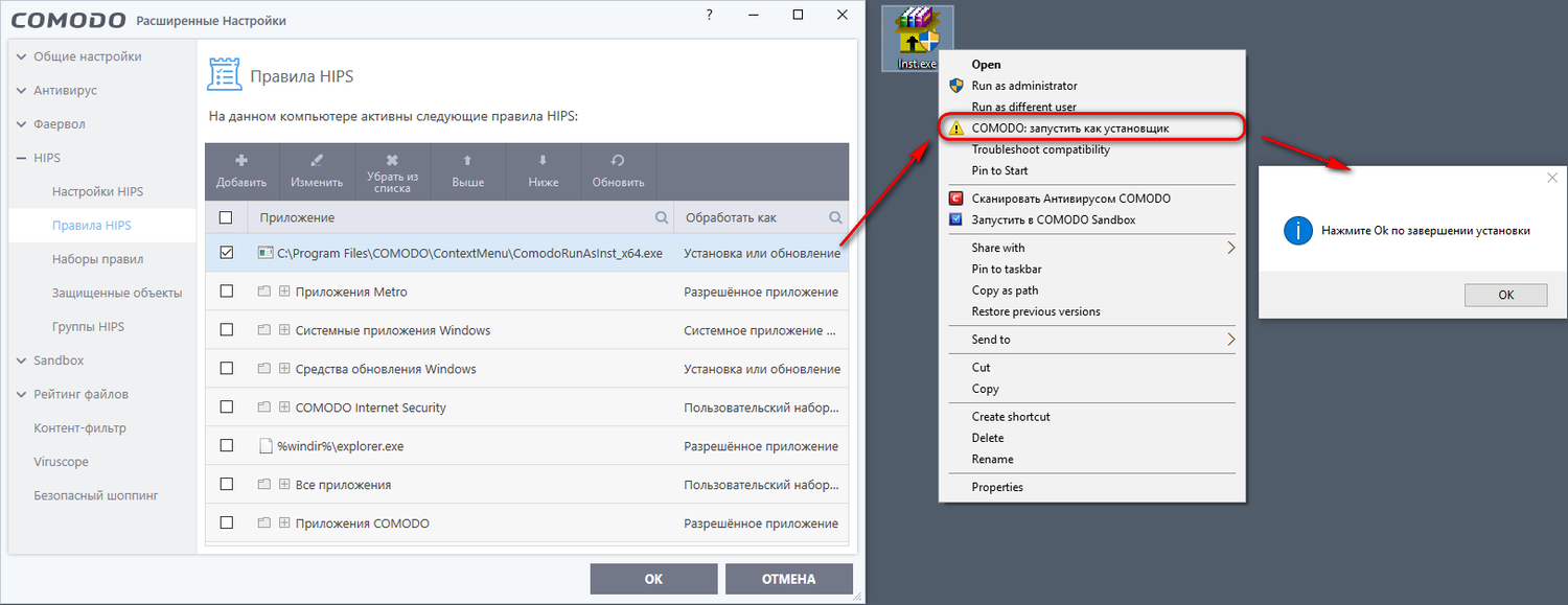 Теперь, чтобы установка какого-либо безопасного приложения прошла беспрепятственно, будет достаточно вызвать на установщике, удерживая нажатой клавишу Shift, контекстное меню и выбрать пункт «COMODO: запустить как установщик». В результате, даже когда сама программа-установщик завершит работу, ее дочерние процессы продолжат выполняться с привилегиями установщика. Эти привилегии снимутся после закрытия специального окна с текстом «Нажмите Ok по завершении установки». Но даже тогда эти процессы останутся исключенными из контроля Auto-Containment.