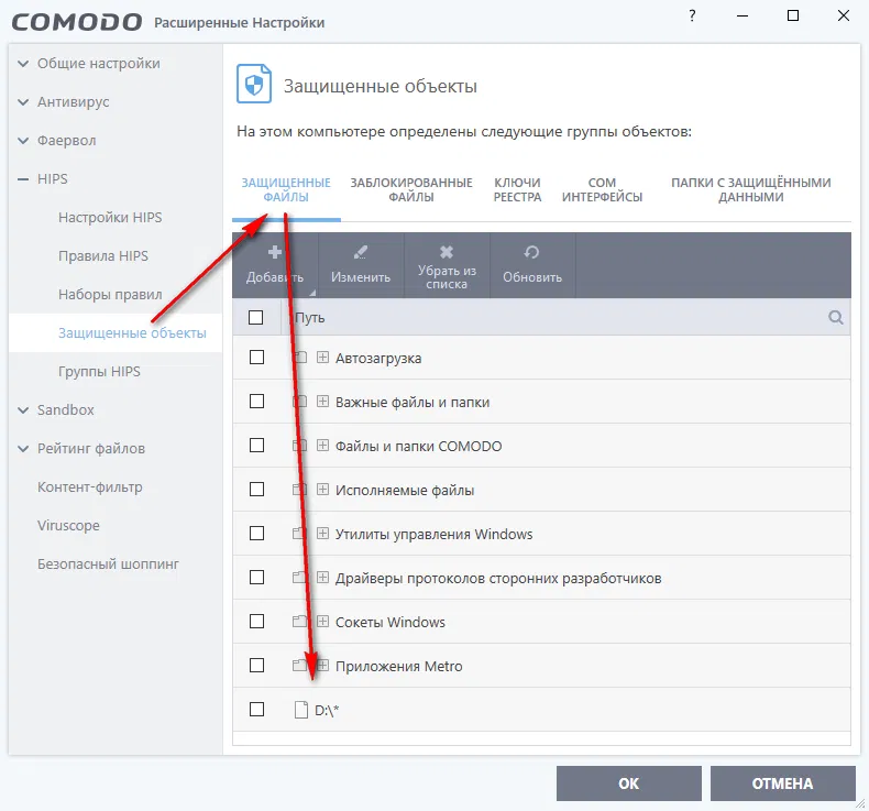 При ограничении доступа программ к различным ресурсам HIPS опирается на данные раздела HIPS → Защищенные объекты. Например, файл или каталог может быть защищен от модификации, только если его полное имя подходит под какой-либо из шаблонов на вкладке «Защищенные файлы». Так, если требуется запретить какой-либо программе изменение файлов на диске D: (независимо от их типа), необходимо сначала занести этот диск в список защищенных.