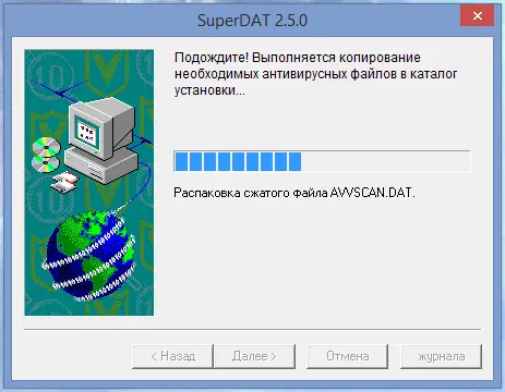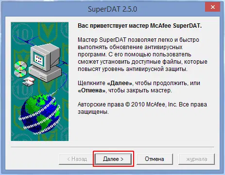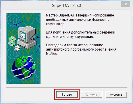 При успешном обновлении вирусных сигнатур McAfee, появится сообщение: Мастер SuperDAT завершил успешное копирование необходимых антивирусных файлов на компьютер. Нажмите Готово для закрытия окна, или Журнал для просмотра лога процесса обновления.