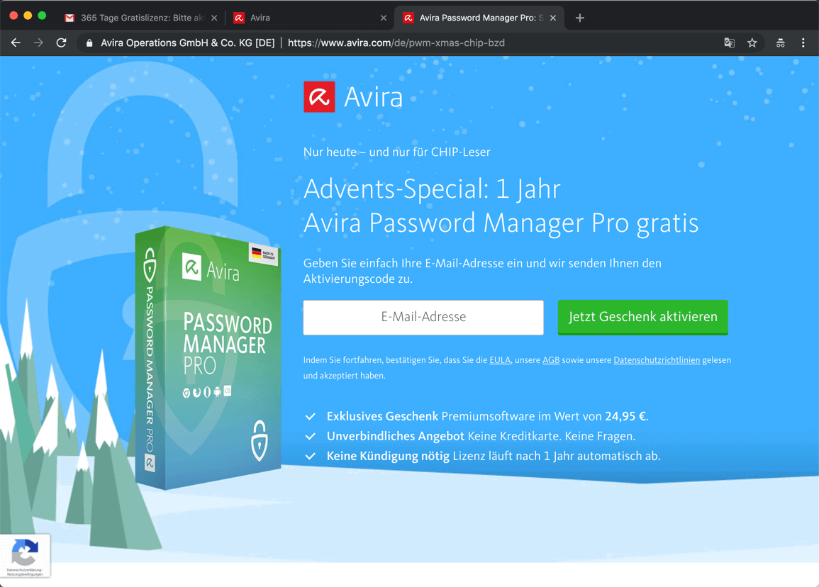 1. Перейдите на страницу промо-акции (на немецком языке) и укажите электронную почту (будет использоваться для вашего аккаунта Avira), чтобы получить бесплатную подписку. Далее нажмите кнопку Jetzt Geschenk aktivieren.