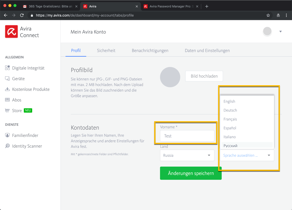 3. После регистрации перейдите на страницу настройки профиля, укажите значение Vorname и поменяйте язык интерфейса на Русский.