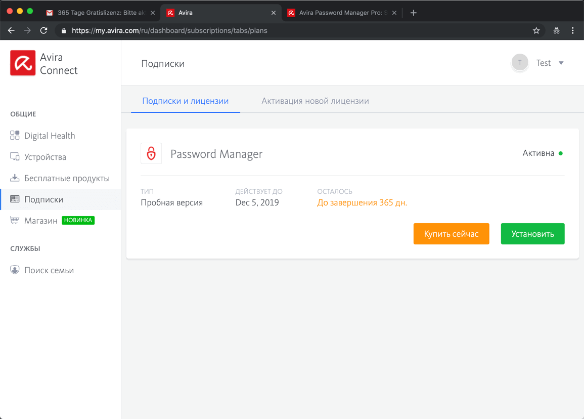 4. После этого перейдите в меню Подписки и для Password Manager выберите Установить. Следуйте инструкциям для установки менеджера пароля.