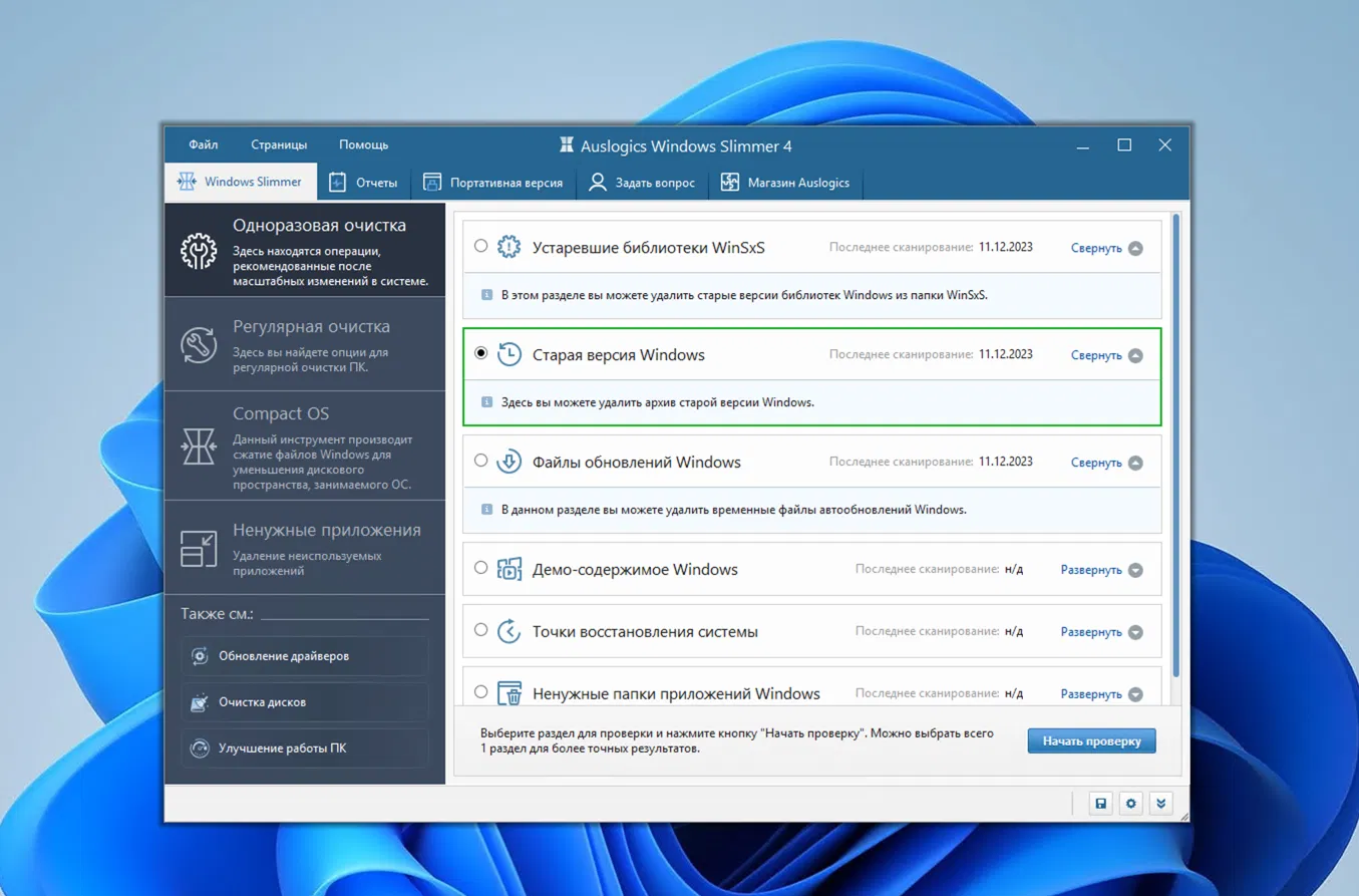 Основные функции Auslogics Windows Slimmer Pro включают: