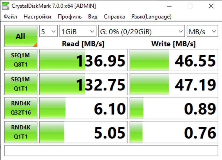 Скорость чтения отображается в столбце Read ( MB/ s), скорость записи в столбце Write ( MB/ s).