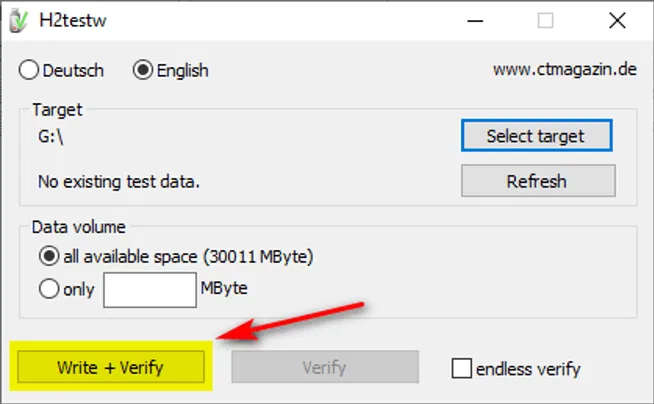 - Нажать кнопку Write+ Verify (запись + проверка) для запуска теста накопителя. Кнопка Verify может быть активной, если ранее тест накопителя уже запускался.