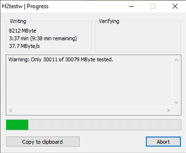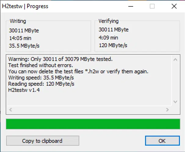 По результатам данного теста скорость записи накопителя 35.5 Мб/с, скорость чтения 120 Мб/с. Ошибки не найдены. Отчёт можно сохранить, нажав кнопку Copy to clipboard, а файлы *.h2w удалить с накопителя, если не планируется повторная проверка.