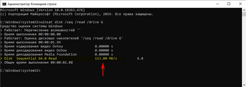 Рис.2 Результат команды winsat disk / seq / read / drive G