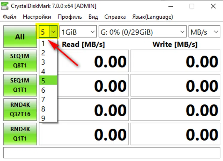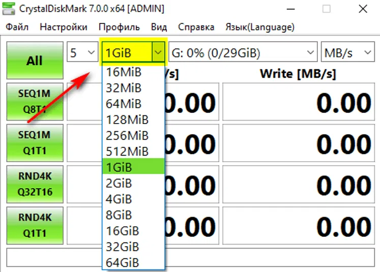 - Следующий параметр, который можно настроить или оставить значение по умолчанию, это количество циклов записи и чтения тестового файла, который будет создан и размещен на выбранном накопителе, по окончании теста файл будет удален программой CrystalDiskMark. В данном примере я выбрала 1GiB, размер тестового файла будет равен этому значению.
