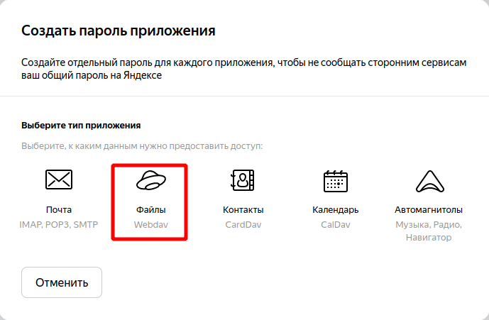 • В появившемся окне выберите Создать пароль приложения Тип приложения - Файлы (Webdav).