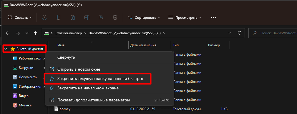 • Нажмите правой кнопкой мыши по значку «Быстрый доступ» , в появившемся меню выберите «Закрепить текущую папку на панели быстрого доступа».