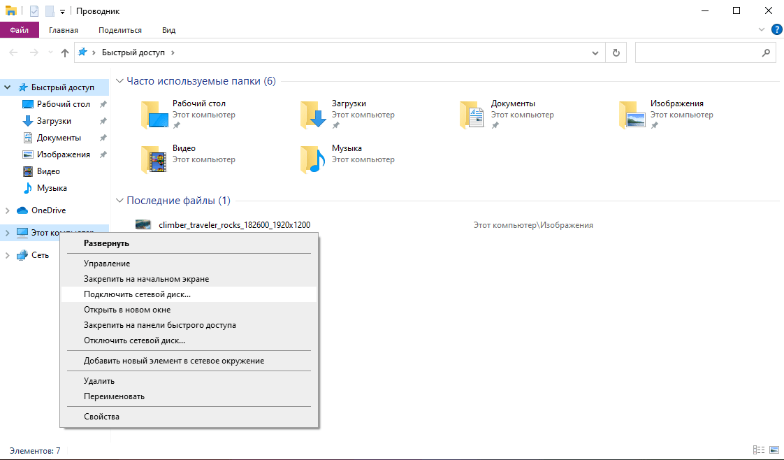• В окне файлового менеджера Проводник нажмите правой кнопкой мыши по значку «Этот компьютер» – в контекстном меню -  «Показать дополнительные параметры» – в следующем окне «Подключить сетевой диск...».