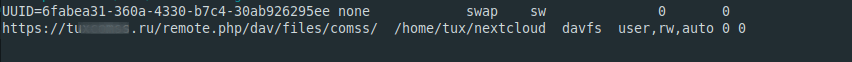 https://название домена.com/remote.php/dav/files/мя пользователя nextcloud/ /home/имя пользователя системы/nextcloud davfs user,rw,auto 0 0