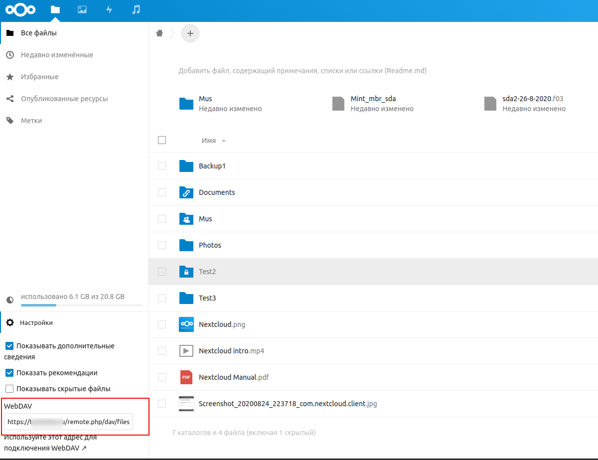Например, для облачного хранилища NextCloud ваша персональная ссылка доступна в левом нижнем углу веб-интерфейса облака, в окне Настройки.