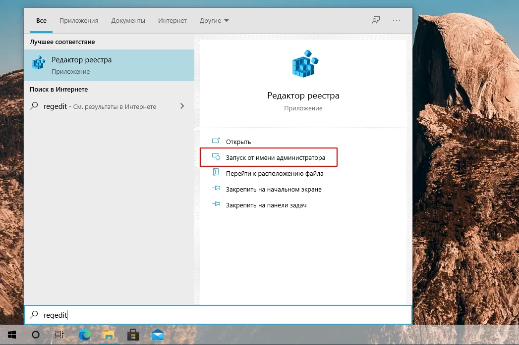 • Редактор реестра. Откройте меню Пуск и с помощью поиска в нем откройте приложение regedit от имени Администратора.
