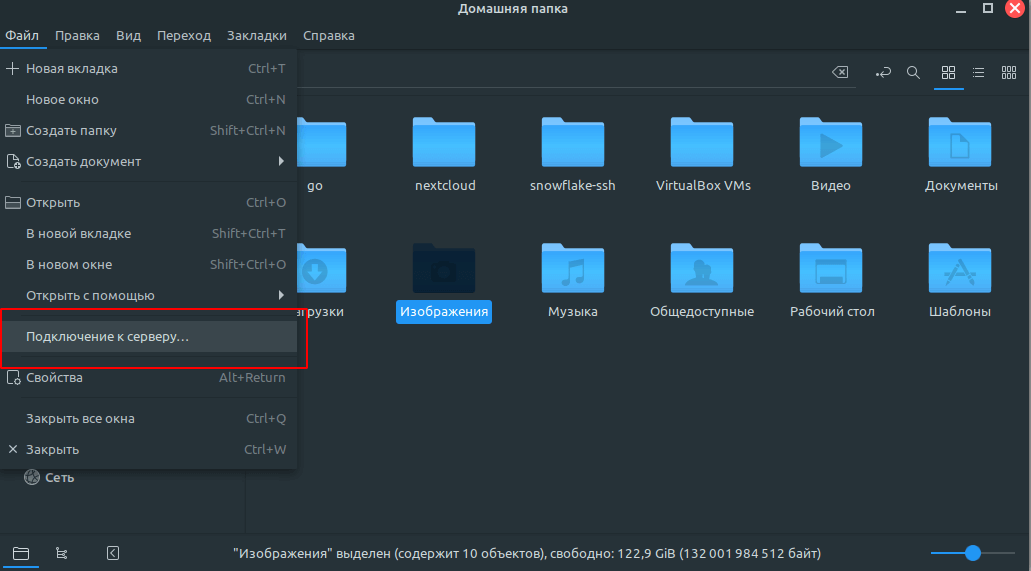 • Откройте файловый менеджер. В зависимости от файлового менеджера расположение опции для подключения может отличаться. Затем, например в файловом менеджере Nemo нажмите на Файл > Подключение к серверу.