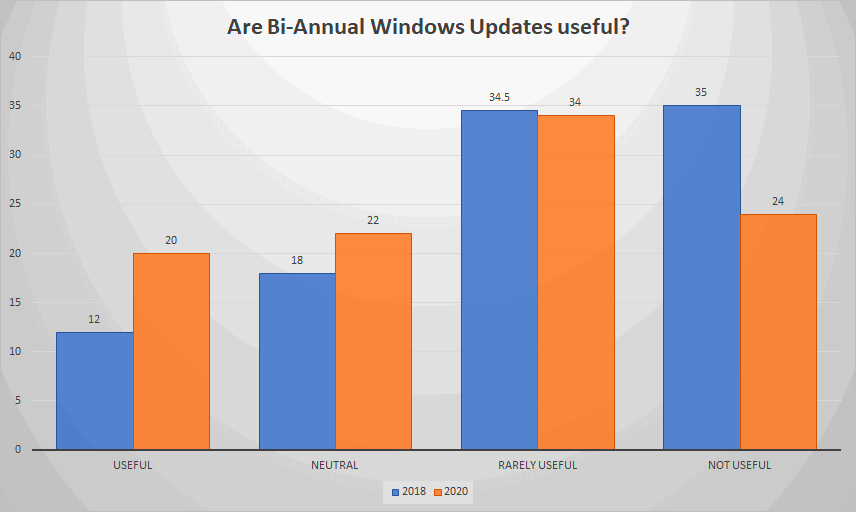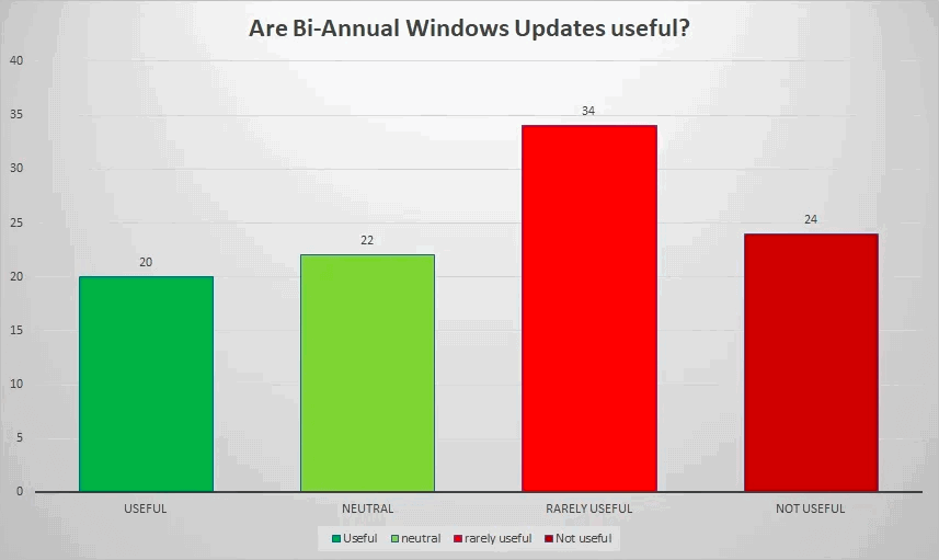 В исследовании принимали участие более 500 респондентов. 58% из опрошенных считают, что система двух крупных обновлений Windows 10 в год является бесполезной (24%) или редко полезной (34%).