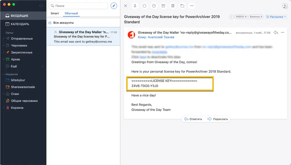 3. На указанный адрес электронной почты вы получите личный акционный код (Giveaway Code – он же LICENSE KEY), необходимый для получения бесплатной годовой лицензии.
