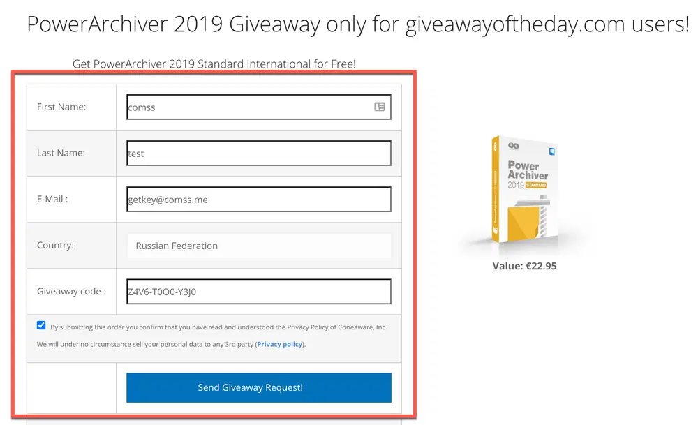 4. Перейдите на страницу активации лицензии на сайте программы (на английском языке). Заполните форму регистрации, указав ваши имя, фамилию, электронную почту, страну и акционный код (Giveaway Code), а также отметив пункт By submitting this order you confirm.... В завершении нажмите кнопку Send Giveaway Request.