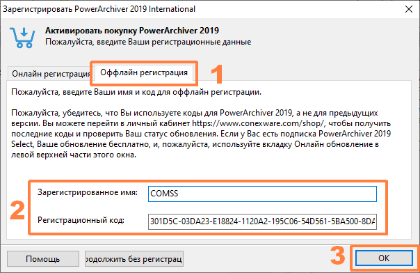 8. В окне регистрации перейдите на вкладку Оффлайн регистрация, введите данные лицензии (Registration Name и Registration Code) и нажмите OK.