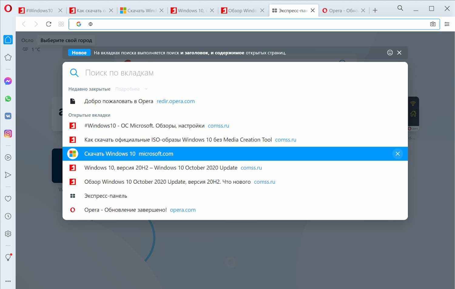 В Opera 73 улучшена функция поиска вкладок. Теперь, каждый раз, когда вы открываете окно поиска вкладок, вам будете доступна кнопка закрытия. Новая кнопка отображается, когда вы выбираете определенную вкладку или когда наводите на нее курсор мыши. Данное поведение аналогично выпадающему меню адресной строки.