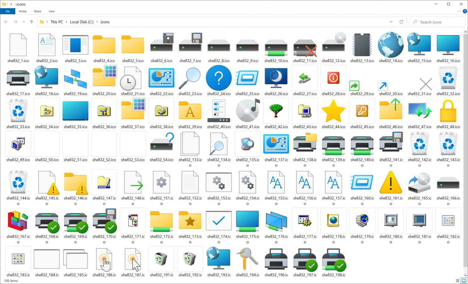 Начиная с Windows 95, Microsoft хранила системные значки для папок, устройств, настроек, панелей управления и приложений в файле Shell32.dll, доступном по пути C:\Windows\System32\Shell32.dll.