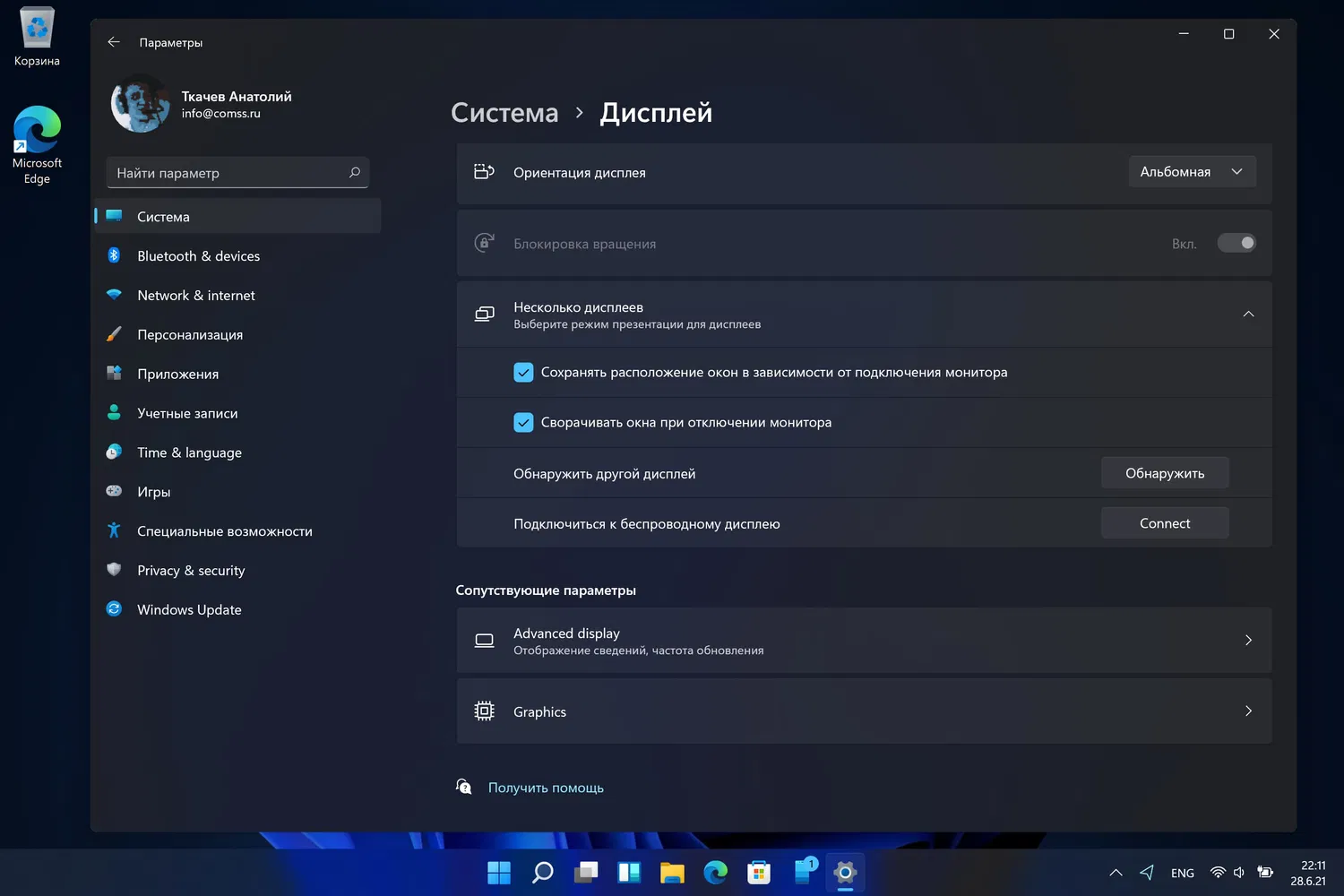 Когда вы отключаете ноутбук от внешнего монитора, окна, расположенные на нем будут свернуты. Когда вы снова подключаете компьютер к монитору, Windows 11 возвращает все на свои места. Настройки для этих функций можно найти в разделе настроек Параметры > Система > Дисплей > Несколько дисплеев.