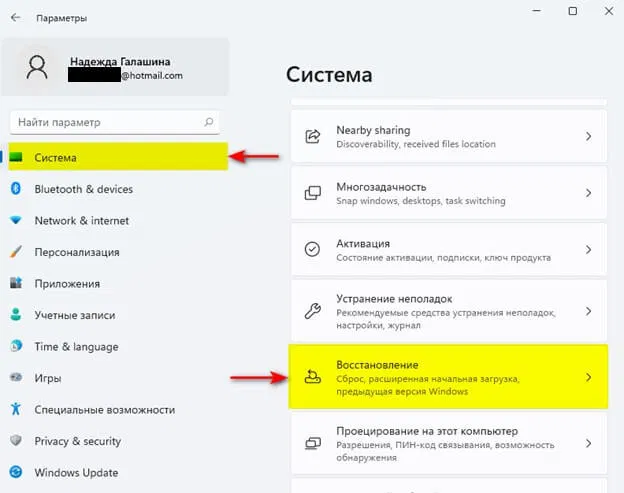 - Выбрать разделы Система > Восстановление