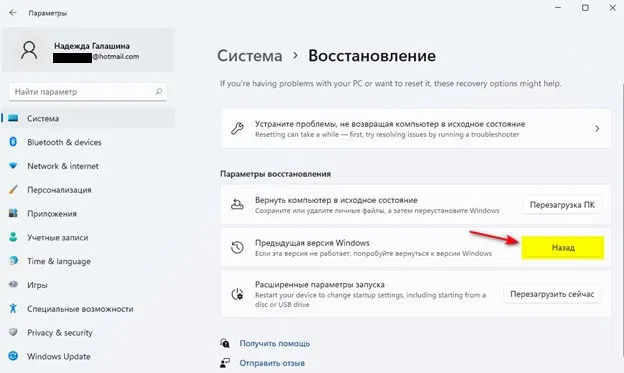 - В разделе Восстановление выбрать Предыдущая версия Windows и нажать кнопку Назад.