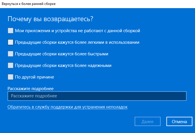 - В диалоговом окне Почему вы возвращаетесь? установить флажок в чекбоксе выбранной причины или в поле Расскажите подробнее указать иные причины перехода к операционной системе MS Windows 10 и нажать Далее.