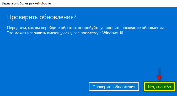 - В следующем диалоговом окне будет предложено проверить и установить последние обновления для устранения неисправностей. Выбрать Нет, спасибо для продолжения процедуры отката к предыдущей версии Windows.
