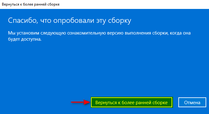 - Для запуска процедуры отката к предыдущей версии Windows нажать кнопку Вернуться к более ранней сборке.
