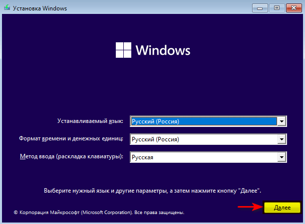 - В настройках языковых параметров оставить значения по умолчанию и нажать Далее.