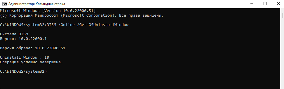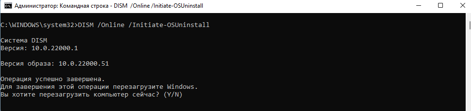 - Ввести команду DISM /Online /Initiate-OSUninstall и нажать Enter