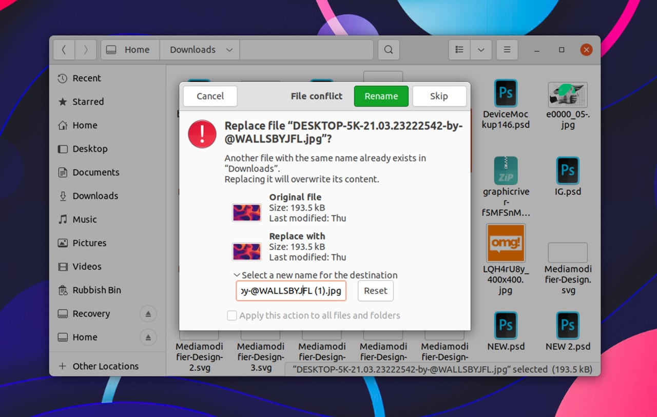 Еще одна область улучшений - диалог конфликта файлов. Он отображается, когда вы пытаетесь скопировать или переместить файл, или папку, имя которой совпадает с именем существующего файла или папки. В Nautilus 40 вы по-прежнему можете заменить или переименовать файл, но теперь у вас есть возможность указать имя для замены, как показано на снимке экрана ниже.