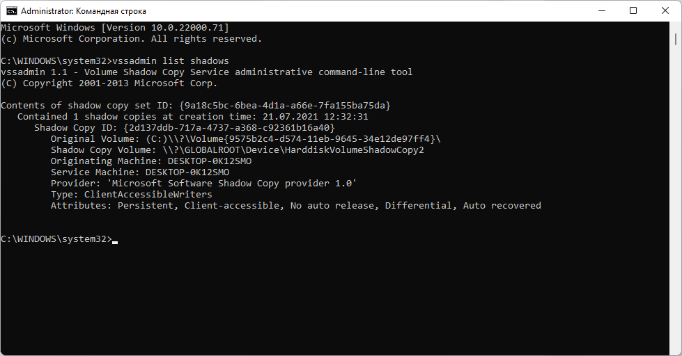 В случае отсутствия теневой копии вы получили следующий результат вывода предыдущей команды: