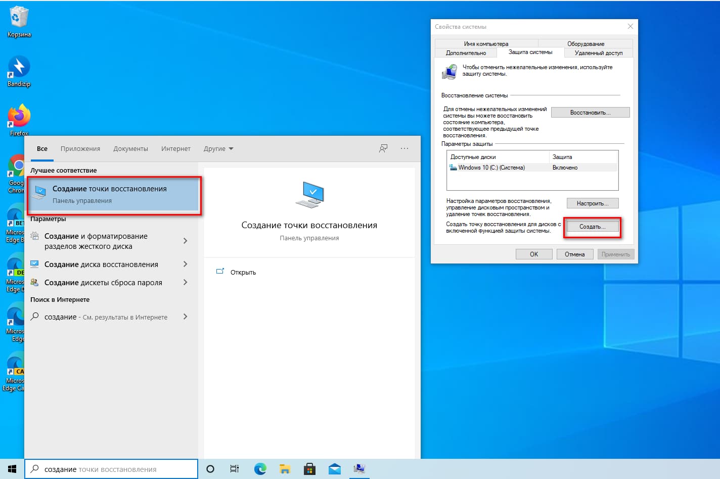 - Создайте новую точку восстановления, набрав «создание» в строке поиска, выбрав «Создание точки восстановления» и нажав кнопку «Создать» в следующем окне.