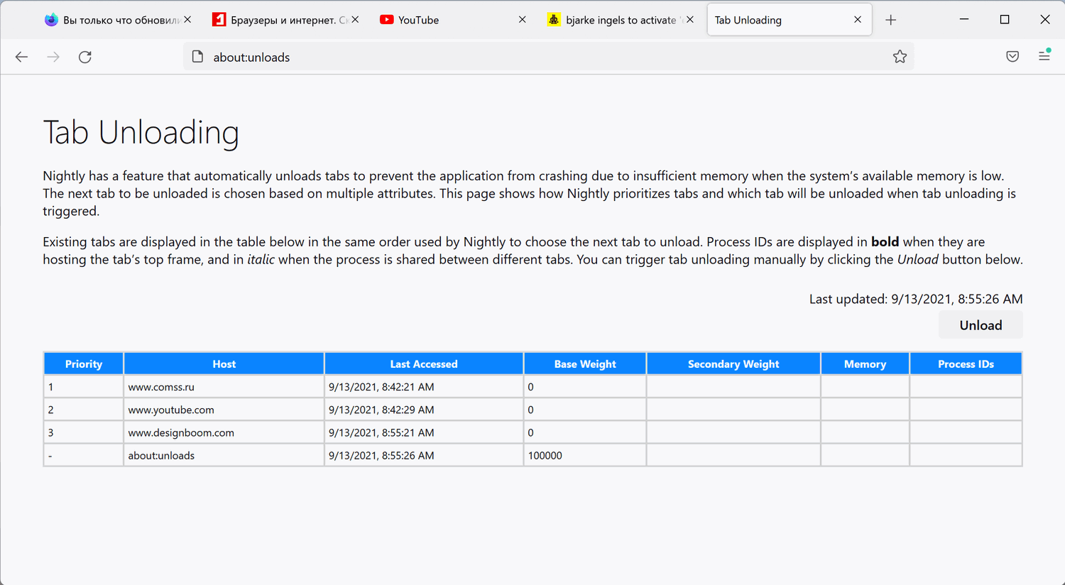 Пользователи Firefox могут перейти на внутреннюю страницу about:unloads, чтобы проверить порядок, в котором вкладки будут выгружены, если объем используемой памяти достигнет определенных пороговых значений. На странице доступна кнопка «Unload» для ручной выгрузки вкладок с наивысшим приоритетом.