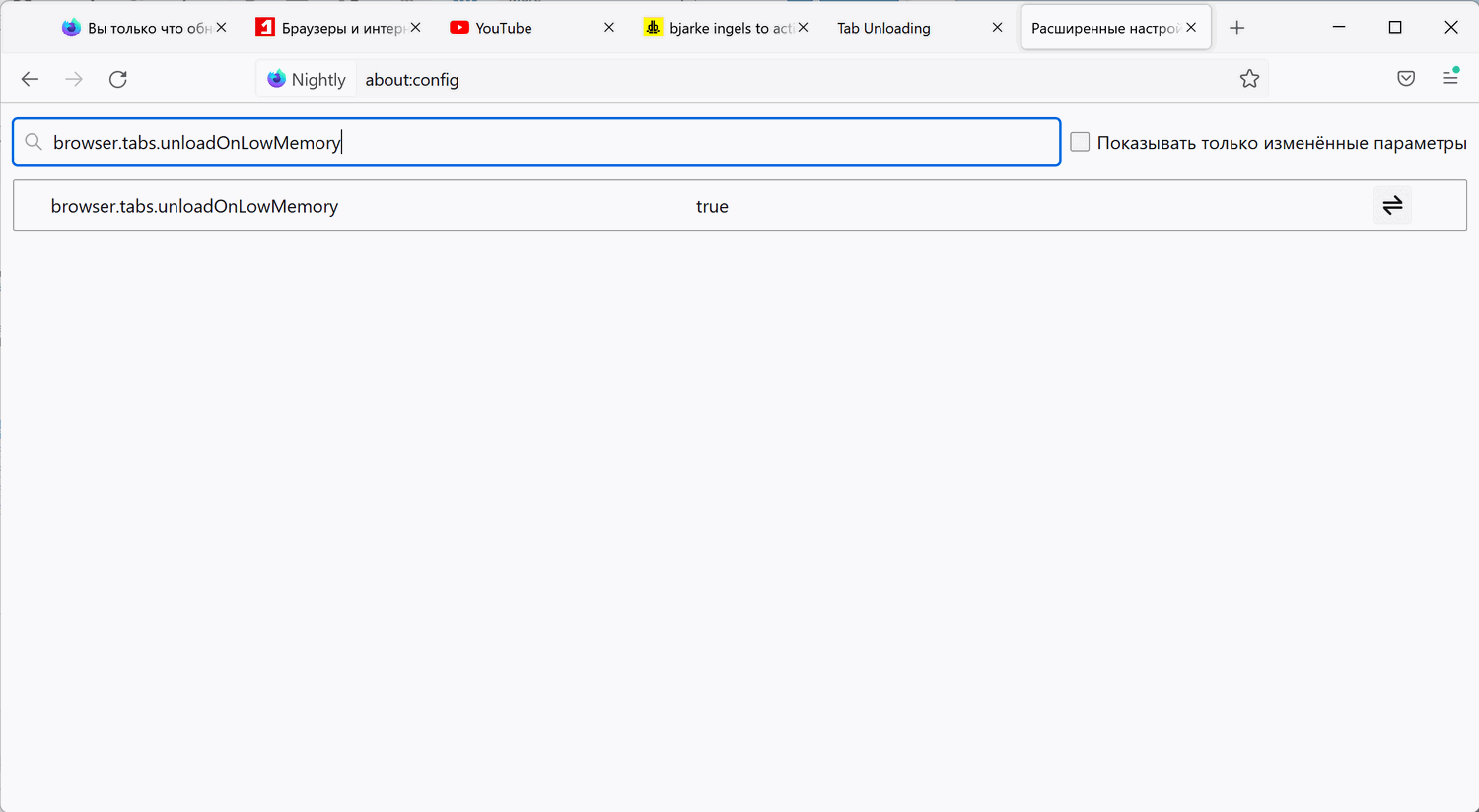 Параметр browser.tabs.unloadOnLowMemory позволяет включать (true) и отключать (false) данную функцию. Настроить параметр можно на внутренней странице about:config.