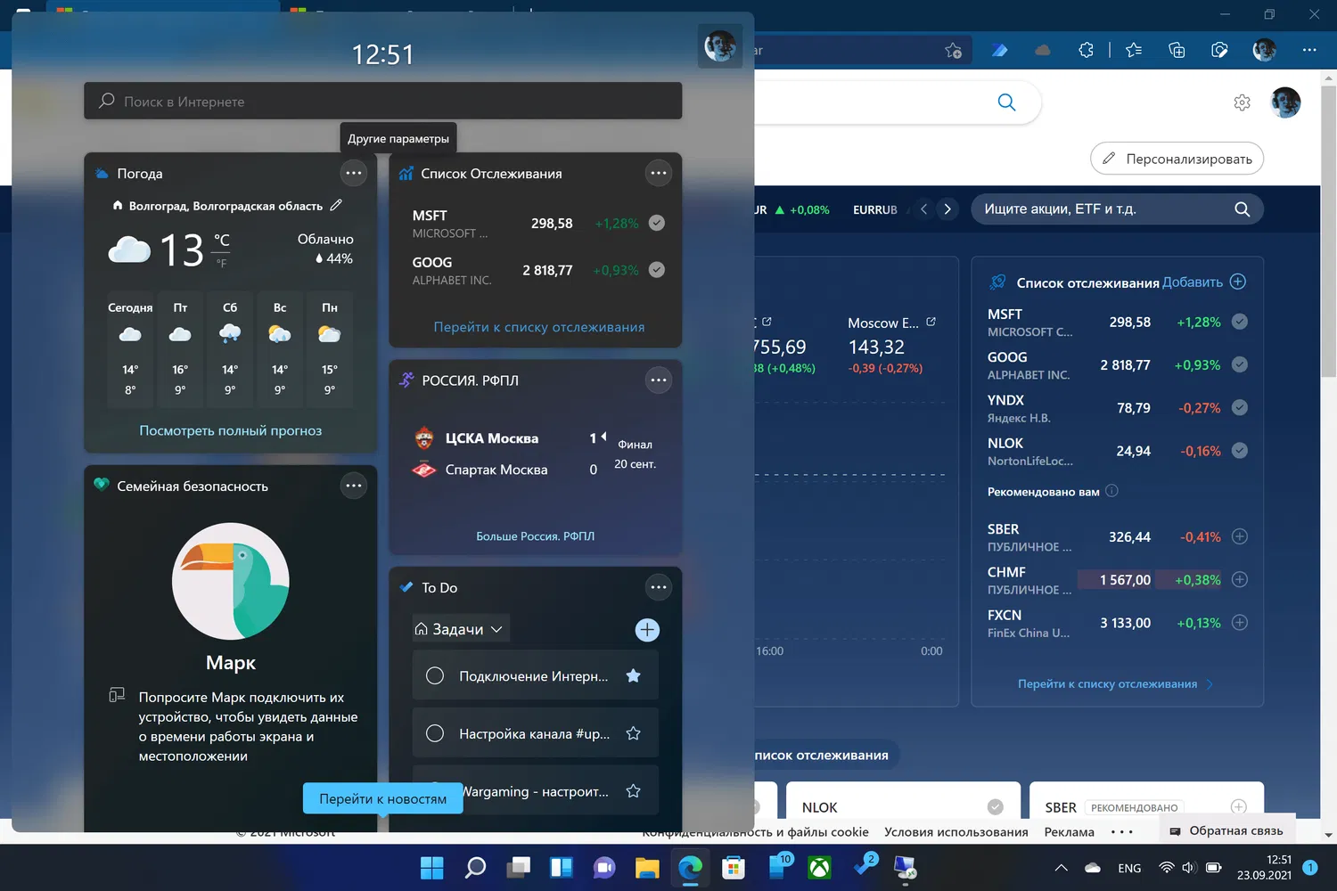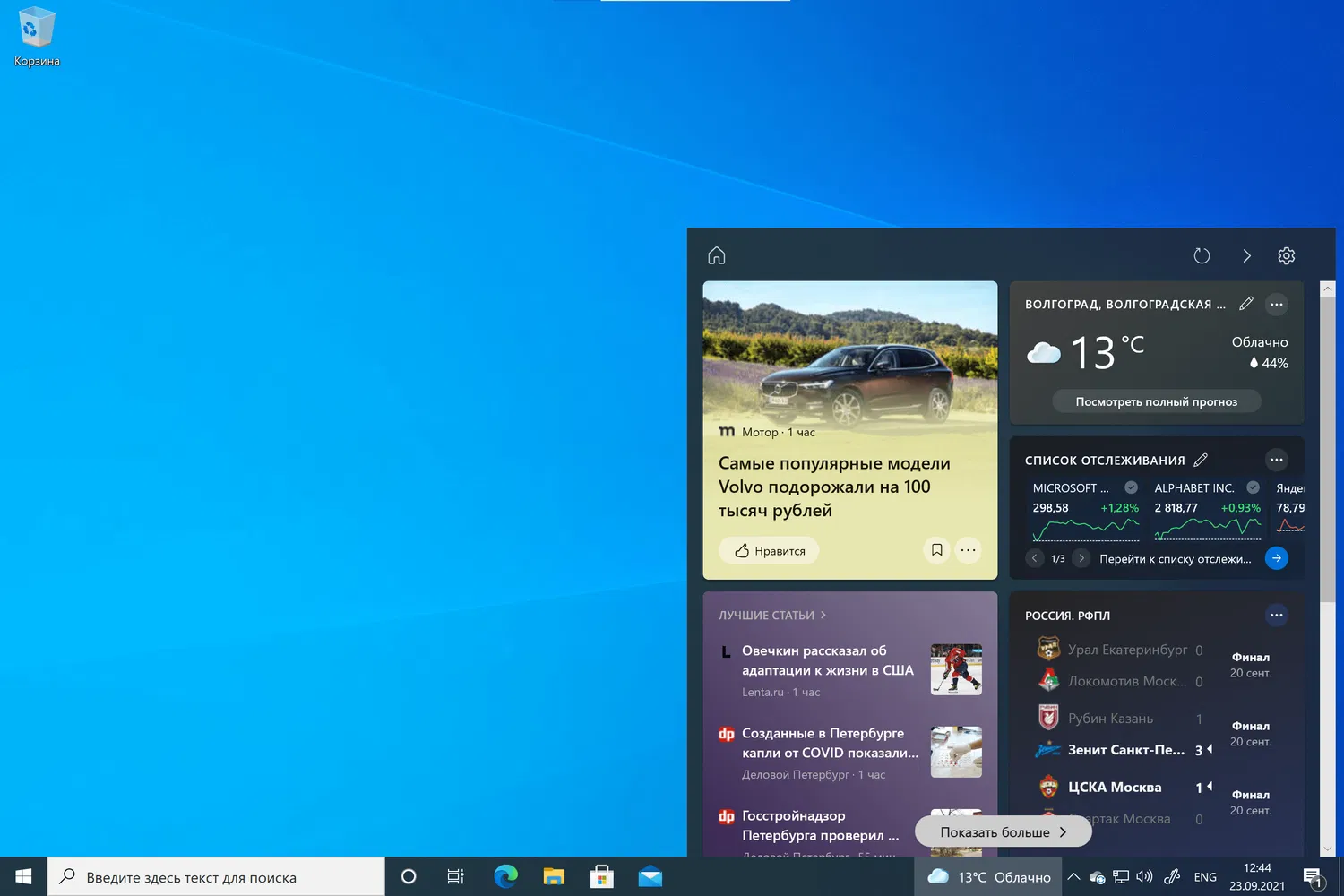 Перед тем, как перейти непосредственно к новой панели «Мини-приложения» в Windows 11, давайте освежим в памяти то, что мы имеем в Windows 10. Сравнительно недавно в «десятке» был представлен виджет «Новости и Интересы», доступный на панели задач. Он представляет собой новостную ленту со сводкой погоды, по умолчанию отображаемую с правой стороны панели задач. Когда вы наводите указатель мыши на кнопку виджета, открывается всплывающее окно, содержащее прогноз погоды, последние новости, результаты спортивных состязаний, котировки акций и другую информацию. Вы можете нажать кнопку «три точки» в верхнем-правом углу всплывающего окна, чтобы настроить интересы или нажать кнопку Посмотреть другие новости, чтобы открыть вкладку Моя лента в Microsoft Edge. Если вы захотите посмотреть конкретную новость, то она также будет открыта именно в Edge, а не в браузере по умолчанию.