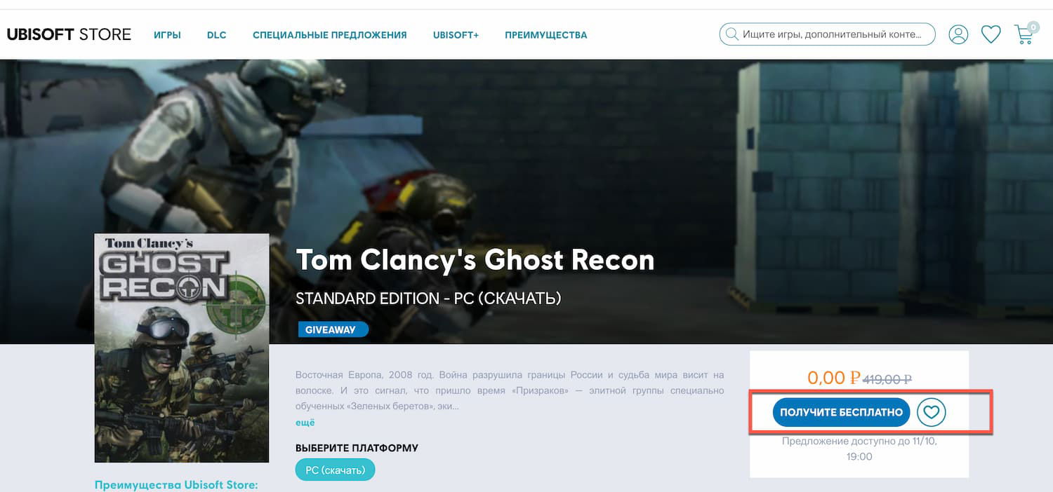 - Перейдите на страницу Tom Clancy's Ghost Recon и нажмите на кнопку Получите бесплатно.