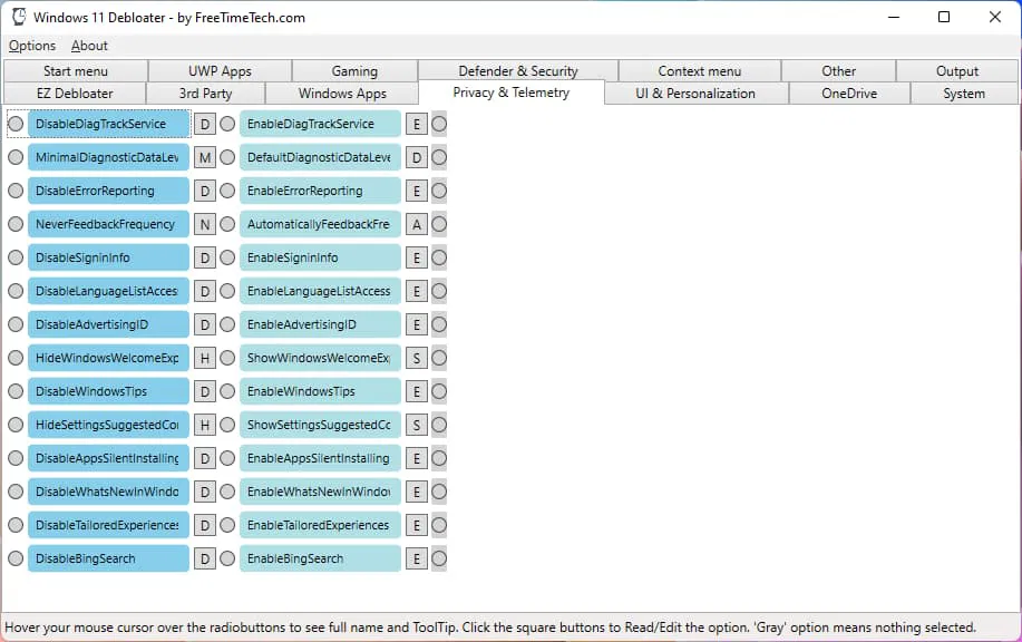 Всплывающие подсказки на данной вкладки будут полезны, так как содержат краткое описание того, что делает сценарий в ОС. Интерфейс может запутывать, поскольку вы получаете пять вариантов выбора для каждой записи. Буквы отображают сценарии PowerShell, которые выполняются при выборе настройки в интерфейсе, а три селектора определяют фактическое действие, которое выполняется при запуске скрипта.