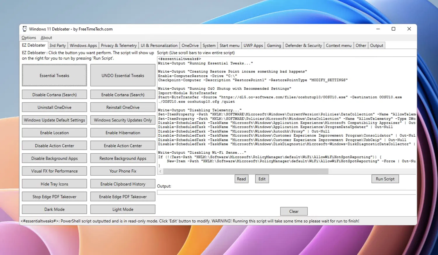 Сами твики отображаются в виде сценариев, но большинству пользователей будет сложно понять, что конкретно делают эти сценарии. Для некоторых записей доступны всплывающие подсказки, но они содержат мало информации об применяемых изменениях. Для выполнения сценария достаточно нажать кнопку Run Script.